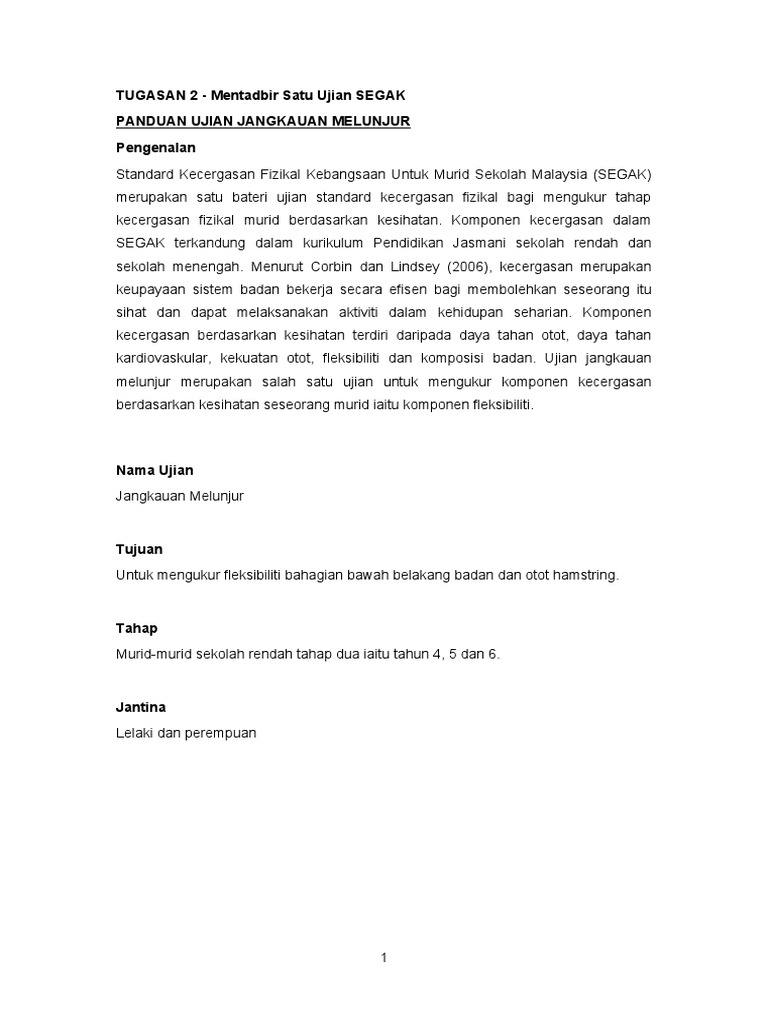 Gaya hidup masyarakat Malaysia kini bertambah sedentari. Ujian SEGAK adalah satu set Ujian Standard Kecergasan Fizikal untuk mengukur tahap kecergasan fizikal murid berasaskan kesihatan. Standard kecergasan fizikal kebangsaan segak rendah bil jenis ujian tahun 4 tahun 5 tahun 6 penggal 1 penggal 2 penggal 1 penggal 2 penggal 1 penggal 2 ulangan ulangan ulangan ulangan ulangan ulangan masa skor masa skor masa skor masa skor masa skor masa skor jarak jarak jarak jarak jarak jarak 1 tekan tubi 2 ringkuk 3.