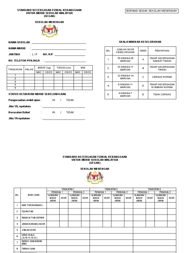 Borang SEGAK Sekolah Rendah BSSR atau Borang SEGAK Sekolah jika murid melengkapkan lakuan yang betul seperti Gambar A B Menengah BSSM. Komponen kecergasan yang diukur dalam SEGAK terkandung dalam Pelajaran Pendidikan Jasmani. Guru dan murid merancang serta melaksanakan aktiviti intervensi berdasarkan keputusan ujian SEGAK.